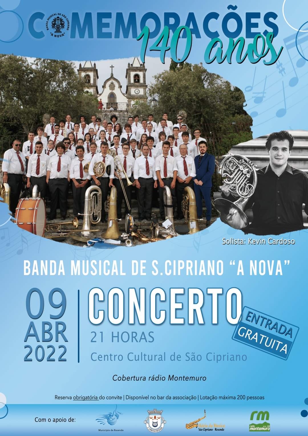 A associação da Banda Musical de S.Cipriano "A Nova" tem a honra de divulgar o primeiro concerto no âmbito das comemorações dos 140 anos desta ilustre associação. Este concerto estava previsto ser realizado no ano transato, mas devido à situação pandémica o concerto teve que ser adiado e só agora foram reunidas as condições para a realização do mesmo.
