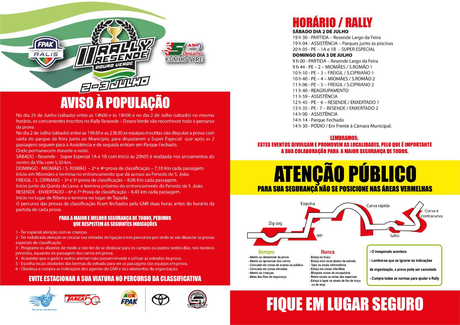 Relativo ao "Rally RESENDE - Douro Verde 2022", informa-se toda a população das limitações ao trânsito, o Percurso de cada prova e o Flyer de Aviso/Sensibilização à População.