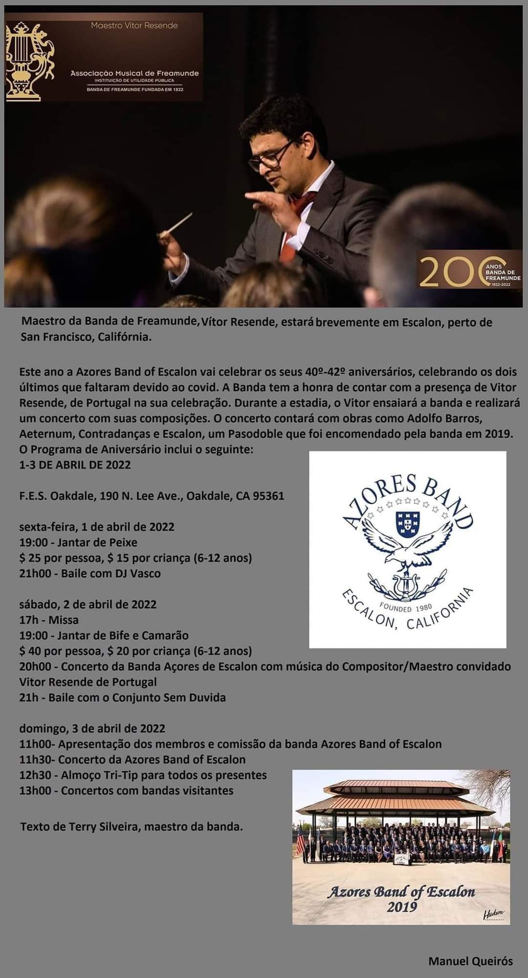 O Maestro da Banda de Freamunde e compositor, Vítor Resende, estará presente amanhã, dia 2 de abril em Escalon. Ensaiará a Azores Band of Escalon na celebração dos seus 40º - 42º aniversários realizando também um concerto com as suas composições.