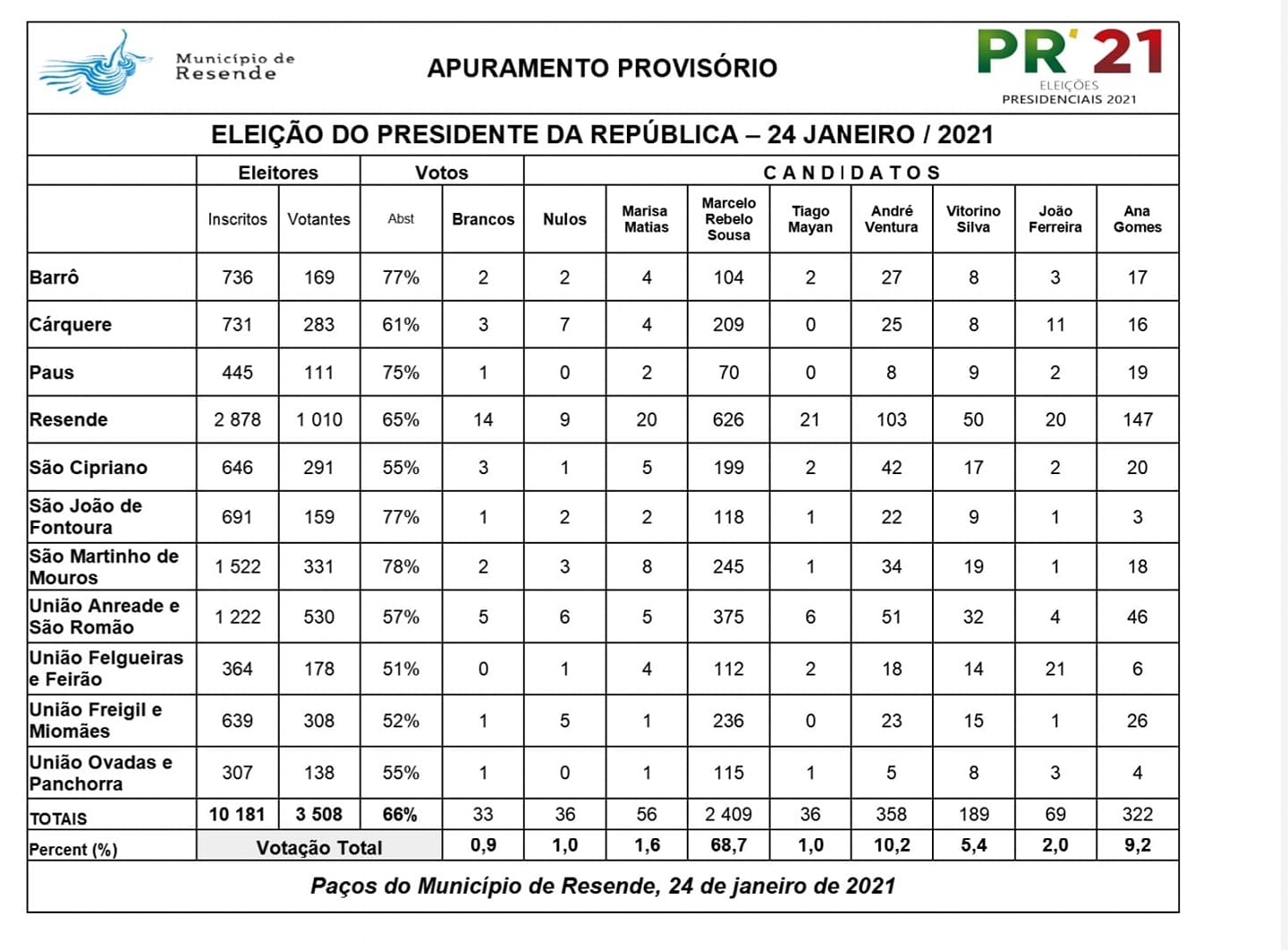 Consulte aqui o apuramento provisório da eleição do Presidente da República, realizada no dia 24 de janeiro, no concelho de Resende. Também pode consultar os resultados no território nacional no seguinte link: https://www.presidenciais2021.mai.gov.pt/resultados/territorio-nacional